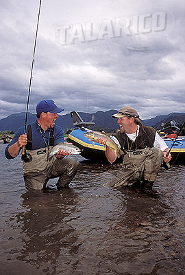 2 happy anglers in waders, fishing for trouts by rubber raft in Paloma River, Patagonia Region, Chile.