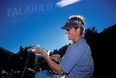 Happy angler with Brown Trout, Patagonia region, Chile.