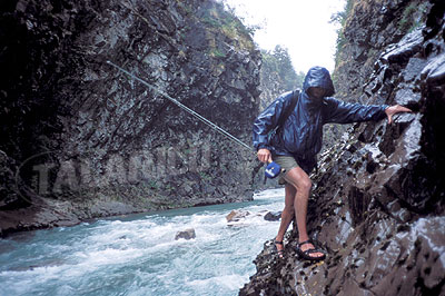 Brent Taylor climbing along a rock wall in a canyon fishing, Patagonia, Chile