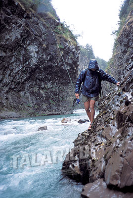 Brent Taylor climbing along a rock wall in a canyon fishing, Patagonia, Chile