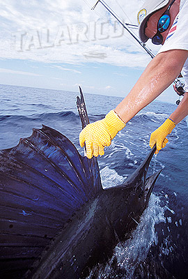 Landing Pacific Sailfish along side of boat, Costa Rica.
