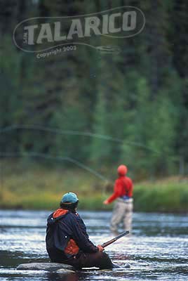 Flyfisherman fishing for Brook Trout, while a man with rifle keeps watch for Polar Bears in the Sutton River, Ontario, Canada