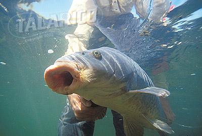 Underwater shot of flyfisherman with a large Carp caught on fly, Susquehqnnq River, Pennsylvania.
