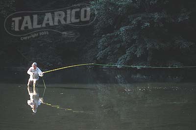 Flyfishing angler Ed Jaworowski casting, wading in Tulpehocken Creek outside Reading, Pennsylvania.