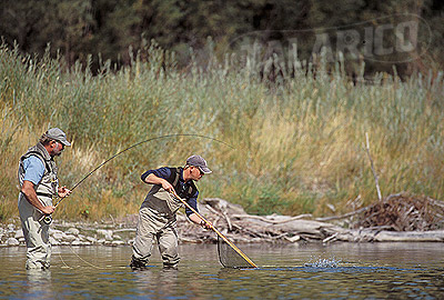 Flyfishermen landing trout with net on Jefferson River, Montana.