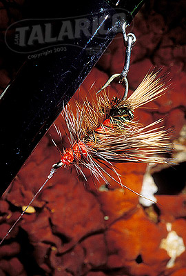 Freshwater flyfishing, close-up of wet fly and rod.