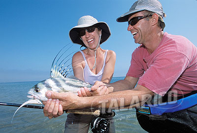 Joanna & Jeff land a Rooster on the beach, Baja.