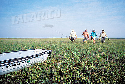 Flyfishing Anglers walking to boat near flat, Harkers Island, North Carolina.