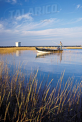 Flyfishing angler poling the boat while fishing for False Albacore at Harkers Island, North Carolina.