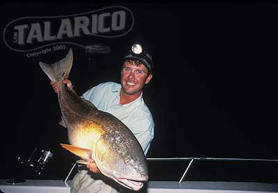 Angler with large Red Drum caught on spinning tackle, under head lamp at night.