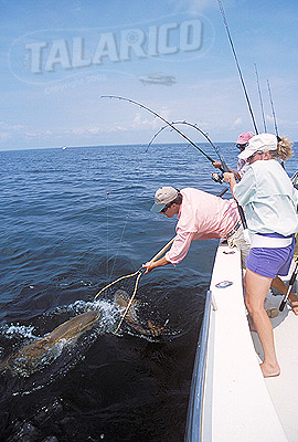 Anglers fighting, landing 2 large Red Drum in landing net, caught on spinning tackle gear.