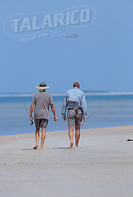 Flyfishing anglers walking on beach at Cape Lookout, North Carolina.