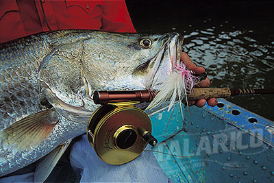 Flyfishing angler showing off large Barramunidi (30Lb) caught on streamer fly, New Guinea.