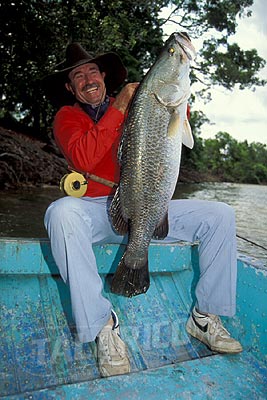 Ed Givens & a 33 lb. Barramundi on a fly, Bendsbach River, New Guinea.