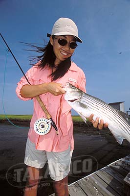 Vickie Lau with a fly caught Striper, Great South Bay, NY.