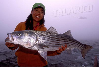 Vicky Lau with Striper on the fly, MA
