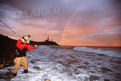 Vickie Lau casting from Montauk Point under a rainbow, NY