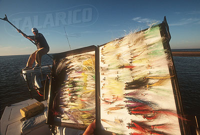 Captain Barry Kanavy poling the flat for Striper, fly box, NY