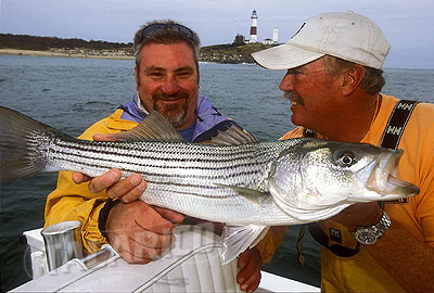 Todd Talarico and Capt. Jim Carey with Striped Bass, Montauk, NY