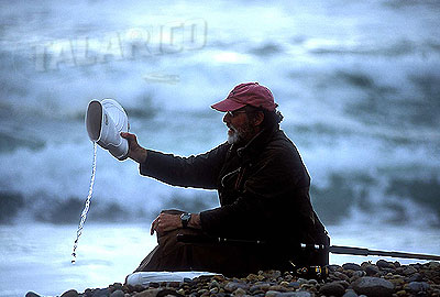 Jimmy Finn empty out boot full of water, Montauk, NY