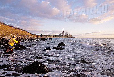Surfcaster, surfishing for Striped Bass at first light, sunrise at Montauk Point, Long Island, NY.