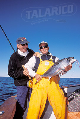 Flyfishing anglers holding Bluefin Tuna, Montauk Point, Long Island, New York.