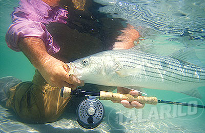 Underwater photo of flyfishing angler releasing a Striped Bass caught on a fly rod.