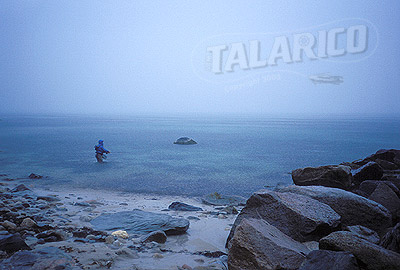 Flyfishing angler, fisherman fishing in a downpour during a rainstorm, Martha's Vineyard, Massachusettes.