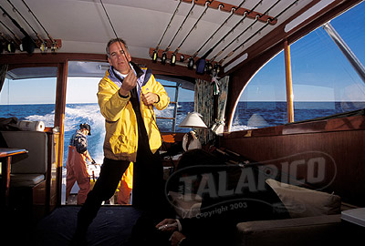 Fisherman, angler rigging tackle onboard a yacht, Bluefin Tuna fishing, Montauk, New York.