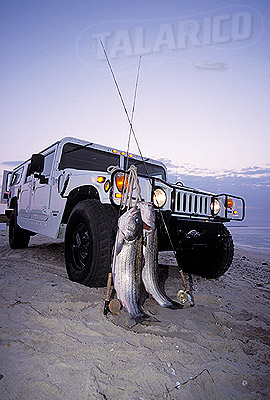 Flyfishing, 2 large Striped Bass caught on fly rod, infront of Hummer Vehicle, Montauk, Long Island, New York.