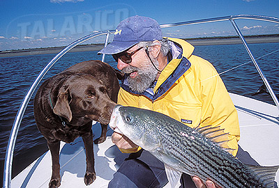Fisherman, Sam Talarico with Striped Bass and Labrador, South Bay, Long Island, New York.