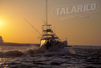 Fishing craft, vessel heading out at sunrise, South Bay, Long Island, New York.