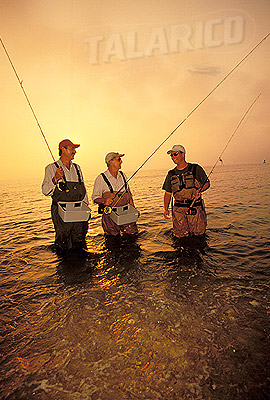 Flyfishing, surfcasters fishing for Striped Bass at sunset, Martha's Vineyard, Massachusettes.