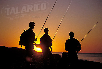 Flyfishing, surfcasters fishing for Striped Bass at sunset, Martha's Vineyard, Massachusettes.