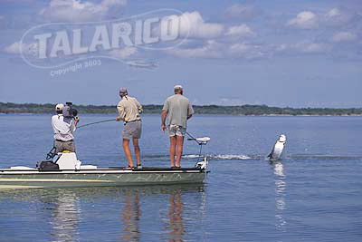 Saltwater flyfishing, anglers, Bill Bishop and Flip Pallot battling a leaping Tarpon, during the filming of Walkers Cay Chronicles, Florida.
