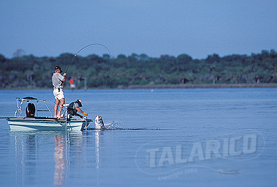 Saltwater flyfishing, anglers landing a Tarpon caught on a fly rod, Florida.