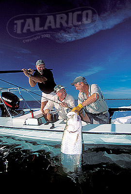 Saltwater flyfishing, anglers Flip Pallot, Lefty Kreh, and Bill Bishop landing a Tarpon on the side of boat, Florida.