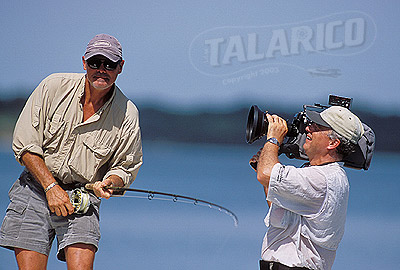 Saltwater flyfishing angler, Bill Bishop fighting a Tarpon during the filming of Walkers Cay Chronicles, Florida.