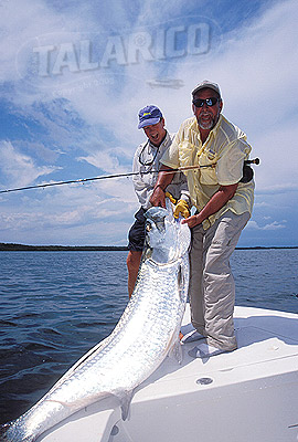 Saltwater flyfishing, happy anglers landed a huge Tarpon on the bow of the boat, Florida.