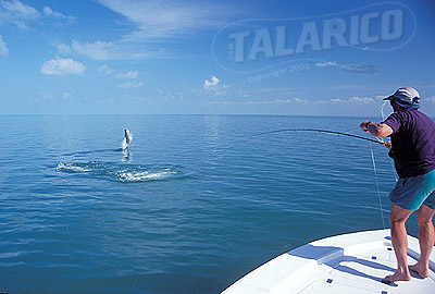 Saltwater flyfishing, angler battling a leaping Tarpon caught on fly rod, Florida Keys.