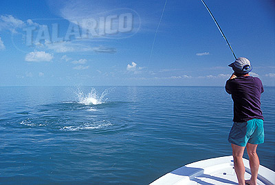 Saltwater flyfishing, angler battling a leaping Tarpon on fly rod, Florida Keys.
