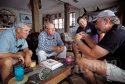 Saltwater flyfishing anglers, Bill Bishop, Lefty Kreh, Rod Harrison, and Flip Pallot, tying, testing fishing knots, Florida.