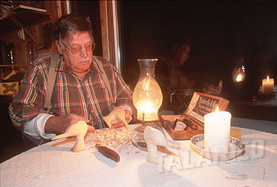 Capt. Jack Combs carving Shell Drake heads at bayhouse, NY.