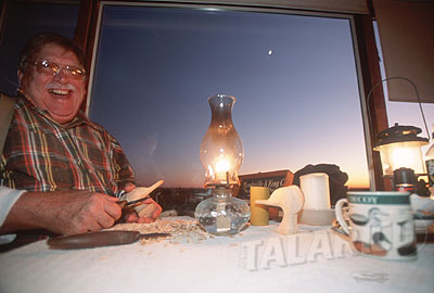 Capt. Jack Combs carving Shell Drake heads at bayhouse, NY.