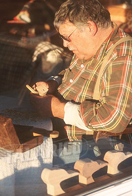 Capt. Jack Combs carving Shell Drake heads at bayhouse, NY.