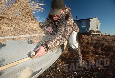 Capt. Barry Kanavy preparing duck boat at bayhouse, NY.