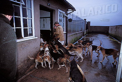 Traditional English Foxhunt, Foxhound pack entering the kennel, England.