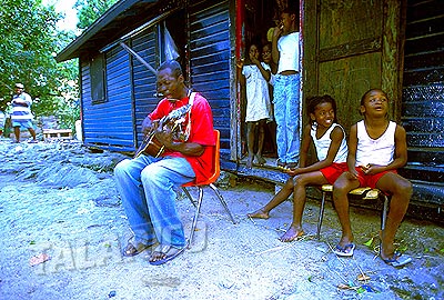 Wilton Russell playing music at Seminole settlement, Red Bay, Bahamas
