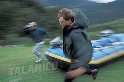 Guides Sam Sellars & Claudio Sandorval haul a inflatable boat down to the Paloma River, Chile