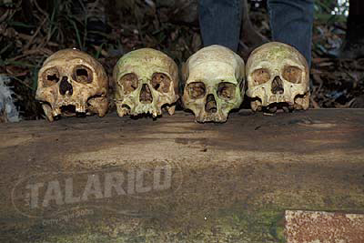 Human skulls on a log for display, New Guinea.